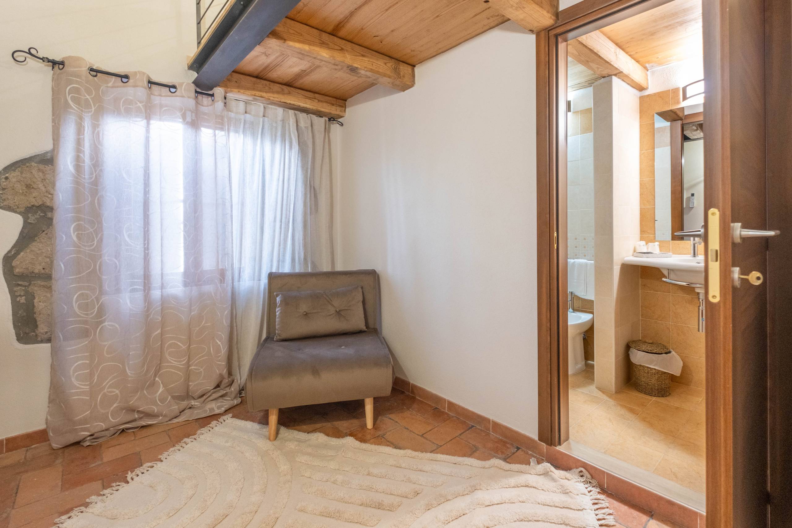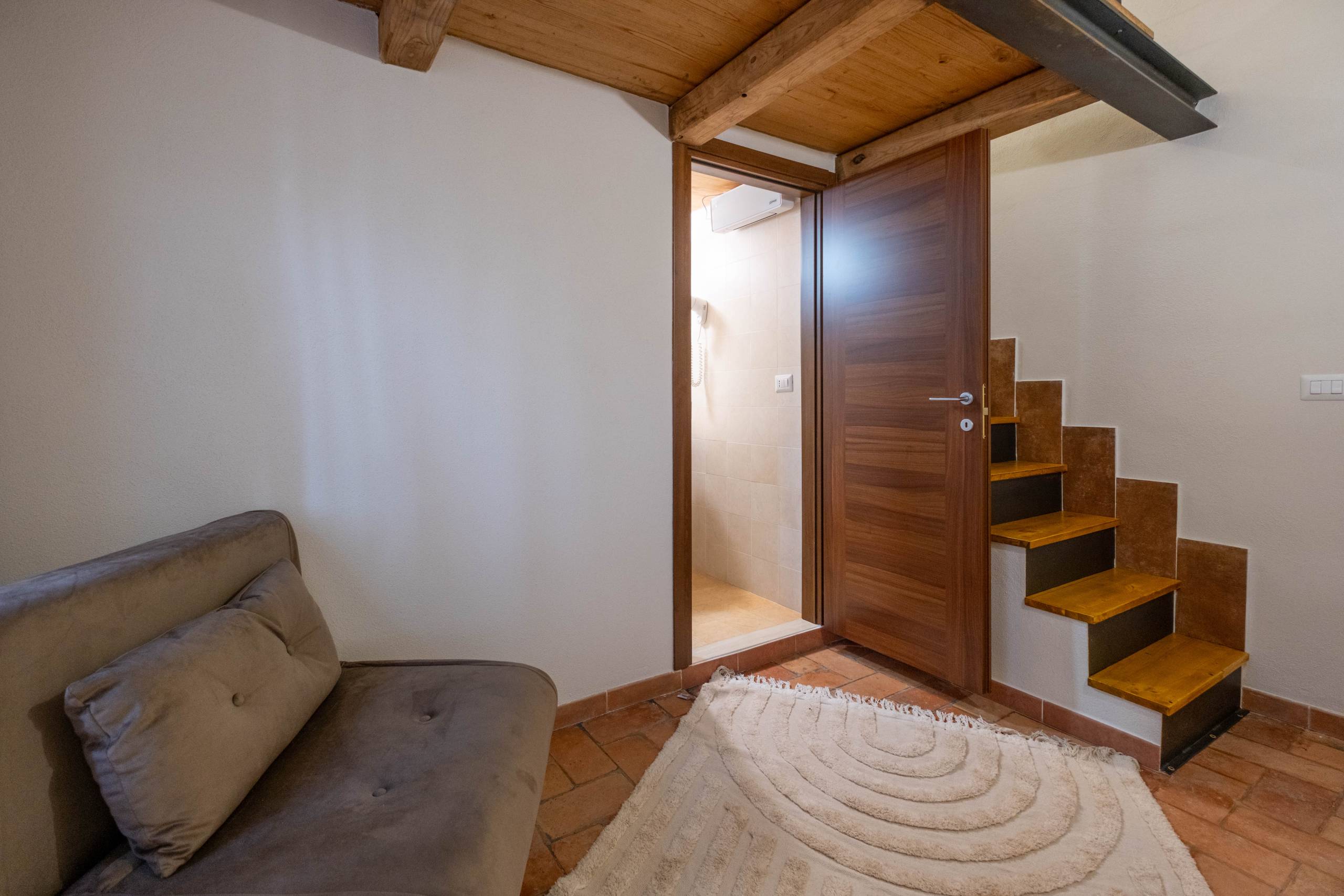 Benvenuti nella camera deluxe “Monte Calveglio”, il nostro gioiello più intimo e suggestivo. Situata al piano superiore del casale, questa camera unica è disposta su due livelli: una accogliente zona giorno al piano inferiore con una comoda poltrona letto si trasforma nella romantica zona notte salendo sul soppalco, dove vi attende un comodo letto matrimoniale. Completamente rinnovata e climatizzata, è la scelta perfetta per coppie o piccole famiglie che cercano un rifugio speciale.